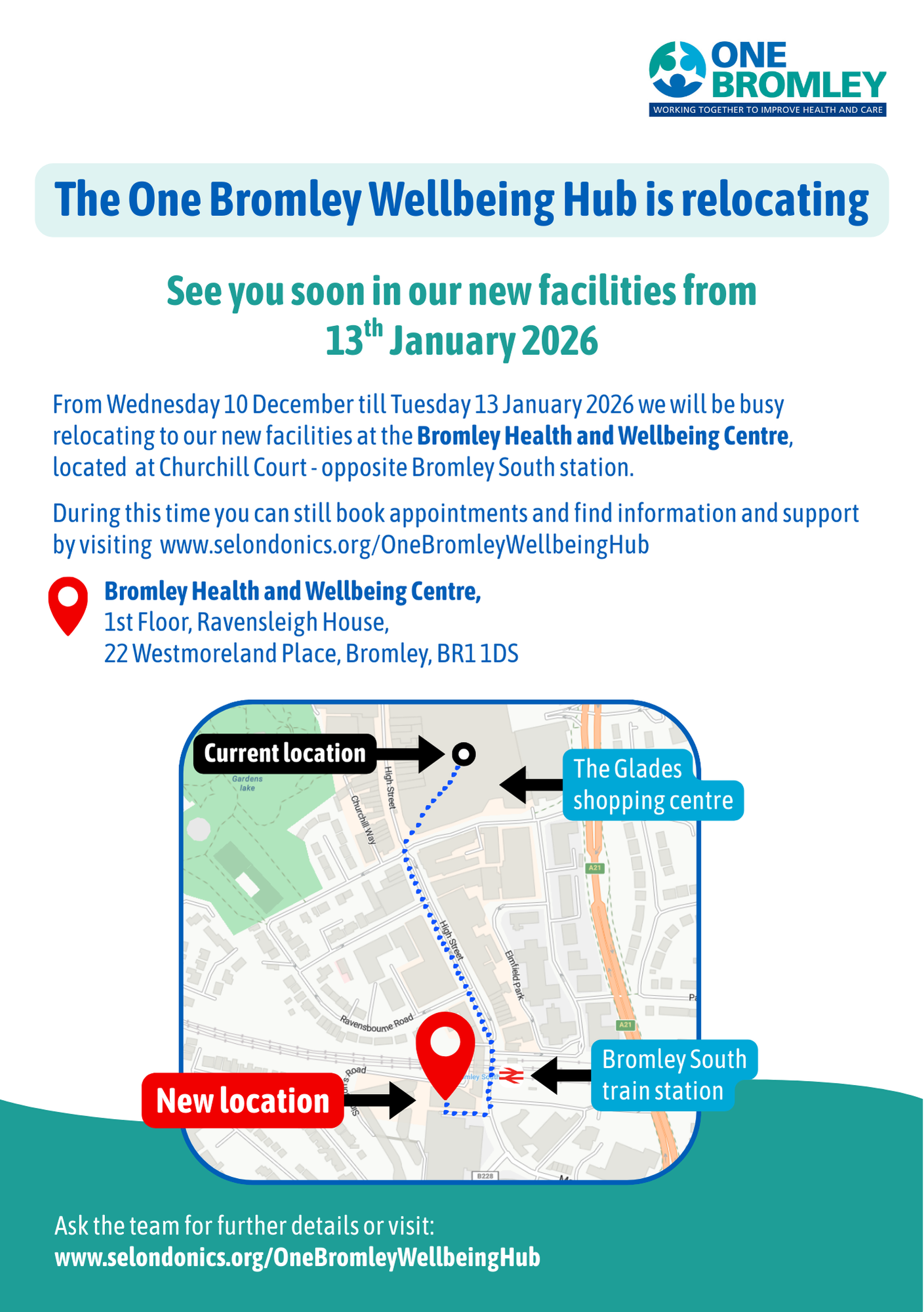 The Hub is currently relocating to new premises at the Bromley Health and Wellbeing Centre. The move will start on Wednesday 10 December. During this time no face-to-face appointments will be offered, however, patients can continue attending booked appointments online and access further information via the usual websites. You will be able to visit the new hub from 13th January 2026, from Monday to Friday, 8am to 8pm and Saturday 9am-1pm.